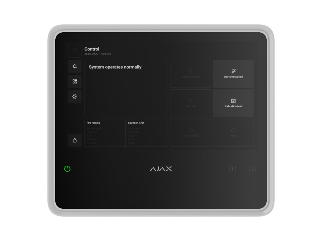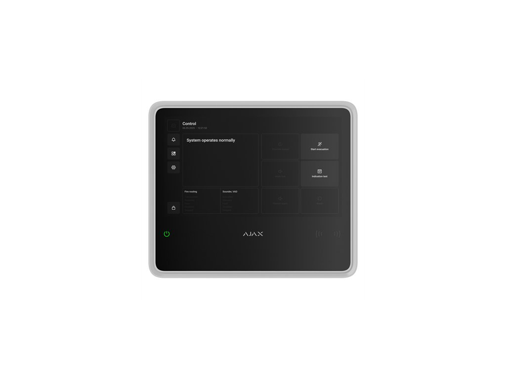 AJAX EN54 Fire Hub Jeweller je bezdrôtové riadiace a signalizačné zariadenie (CIE) pre požiarny poplašný systém, ktoré podporuje aj zariadenia na ochranu proti vlámaniu. Tento moderný hub s dotykovou obrazovkou predstavuje komplexné riešenie pre správu požiarneho bezpečnostného systému, ktoré je zároveň jednoduché na inštaláciu, používanie aj údržbu. Vďaka vstavaným komunikátorom a plne bezdrôtovému pripojeniu zariadení je možné systém rýchlo nasadiť a pripojiť k monitorovacím staniciam prostredníctvom aplikácií Ajax.
