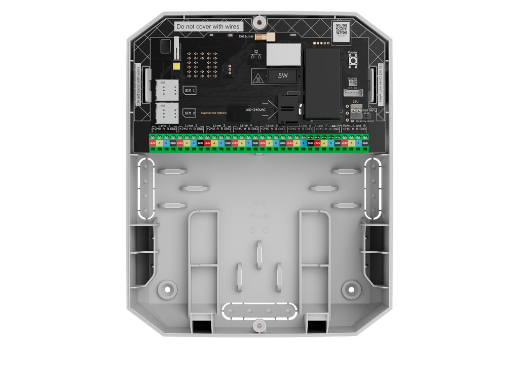 • Superior Hub Hybrid 2 se záložní baterií 7 Ah může napájet systém 15 drátových zařízení po dobu 60 hodin. Bezdrátová zařízení pracují na baterie a nevyžadují dodatečné napájení